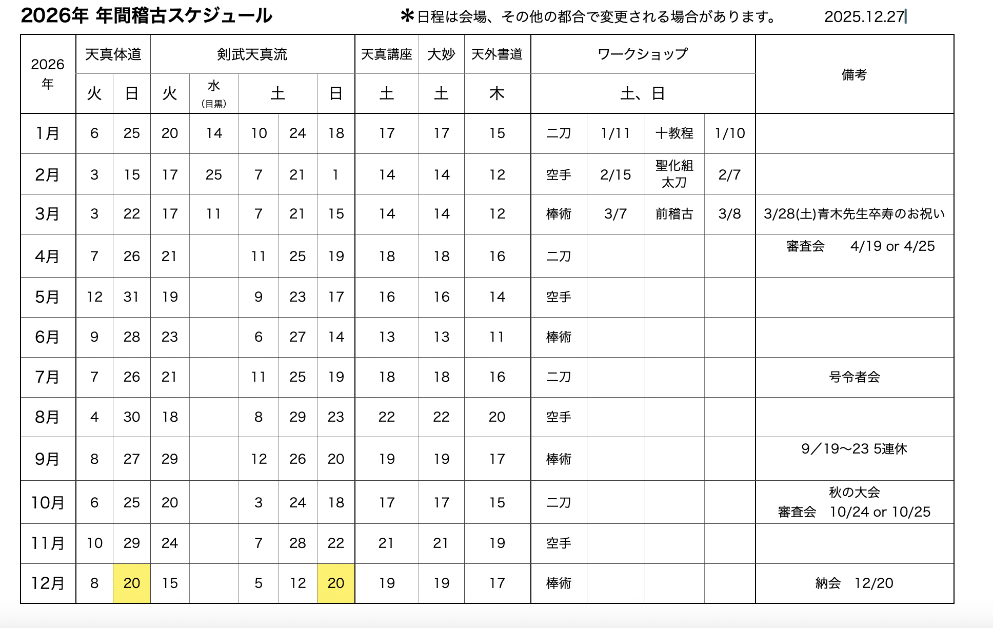 • 天真会の全てのクラス(天真体道、剣武天真流、天真講座、天外書道クラス)の「年間カレンダー」「稽古スケジュール(種目別)」、「2025年イベントスケジュール」、「2026年イベントスケジュール」は下記よりご覧ください。